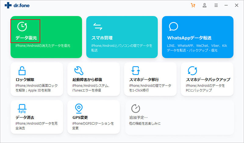 ステップ1:「iPhoneデータ復元」をパソコンにインストールして起動してから、「データ復元」をクリックして、USBケーブルでiPhoneをパソコンに接続してください。iPhoneが検出された後は「復元」ボタンをクリックしてください。