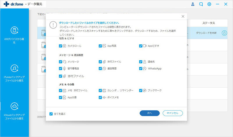 ステップ3:「ダンロード」ボタンをクリックしてから、ファイルの種類を選択して「つづき」ボタンをクリックして続くことができます。スキャンが終わると、結果をプレビューして必要なアイテムを選択してください。それから、「パソコンに復元」ボタンをクリックして削除されたビデオをiPhoneから復元しましょう。